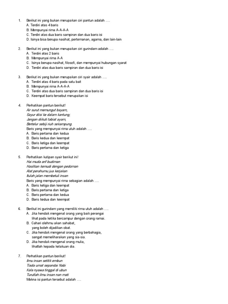 Terikat oleh rima dalam setiap baitnya. Karyawan sastra bukan hanya pantun dan puisi saja yang harus kamu ketahui. Gurindam merupakan suatu puisi lama yang berisi dua bait, dalam setiap baitnya ada dua baris kalimat dengan rima yang sama, yang satu kesatuan secara utuh. Gurindam dibawa oleh sastra hindu atau orang hindu. Memiliki jumlah suku kata paling tidak 12 d.